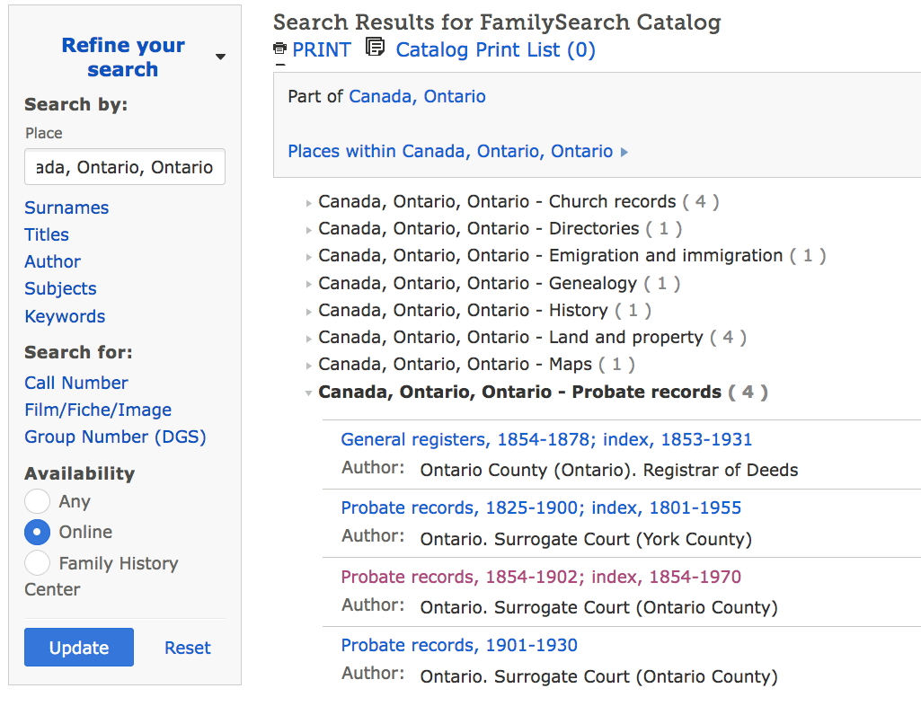 Start by searching for Ontario County records in the FamilySearch Catalogue. Using the default “Place” search, enter “Ontario”. From the suggestions offered in the drop-down menu, pick “Canada, Ontario, Ontario”. Under Availability, select “Online”. And Search.